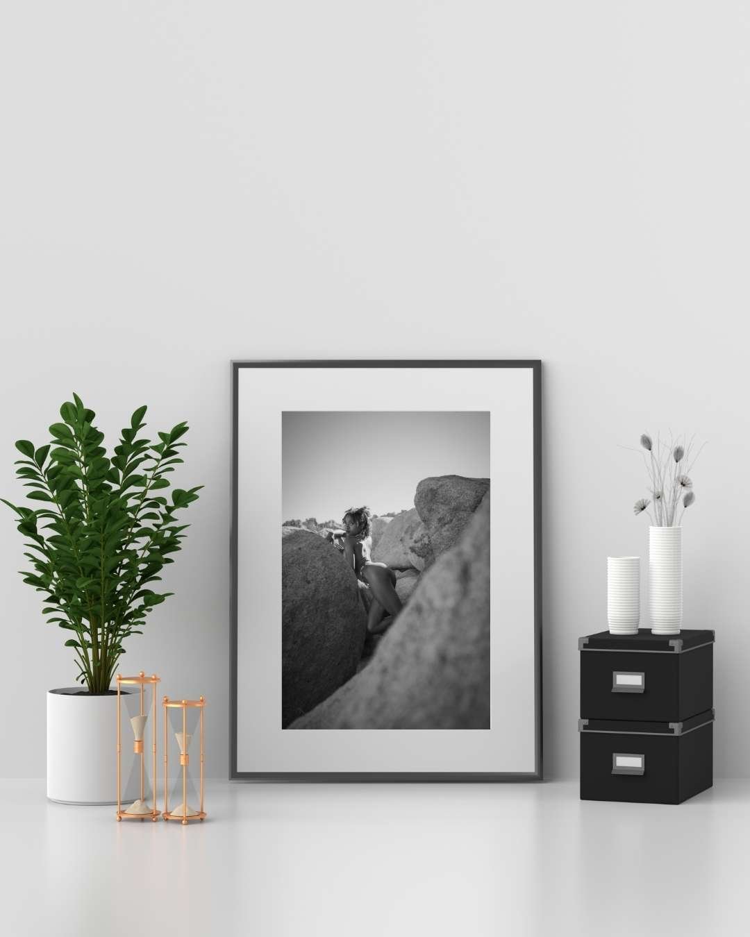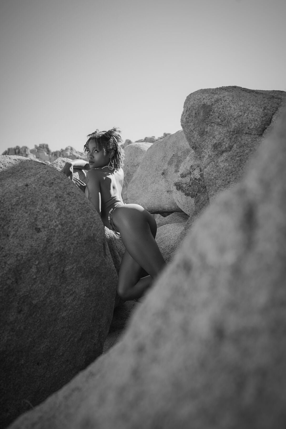 Divine stands between towering desert rocks, her figure a bold yet serene presence against the vastness of Joshua Tree’s ancient landscape. Every line, shadow, and texture speaks to a sacred strength — the kind found not in noise, but in stillness.