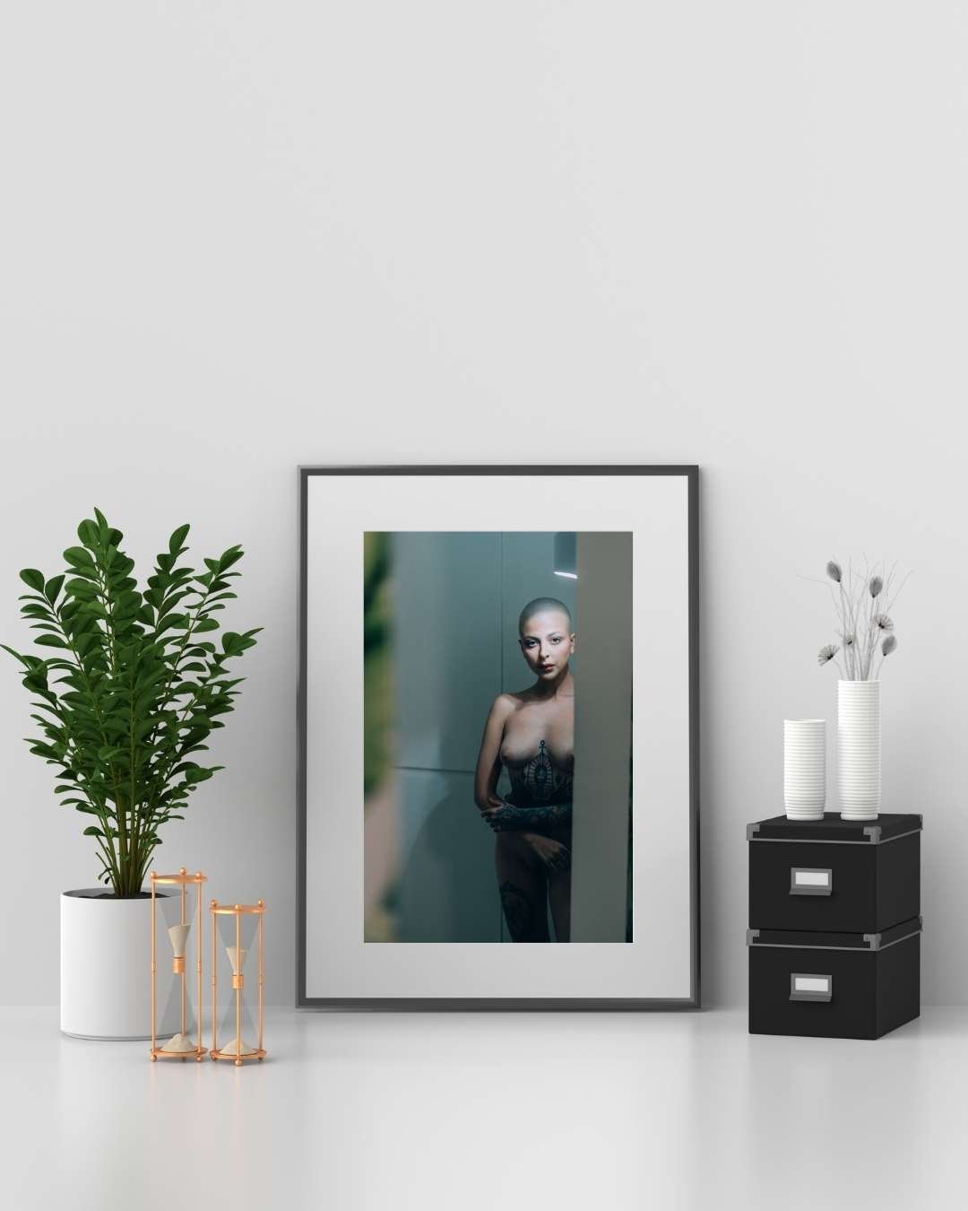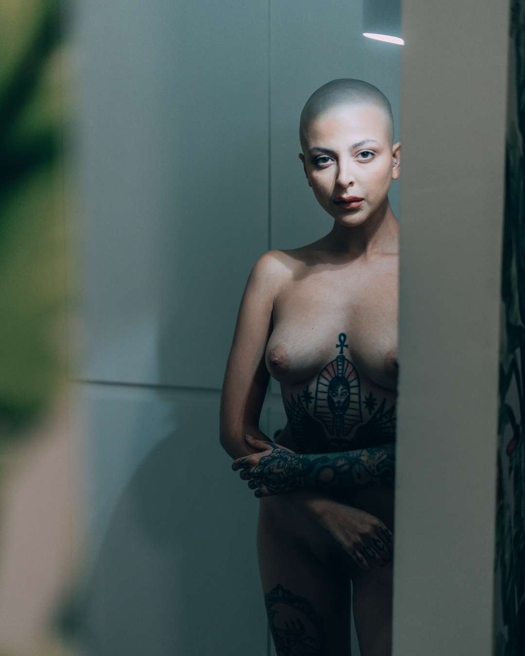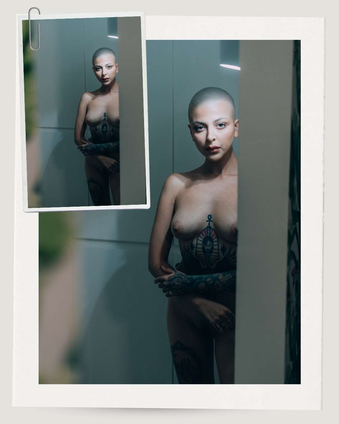 This stunning expressive fine art nude portrait of Madam Soph captures a moment of raw beauty and vulnerability, showcasing her mesmerizing presence. Shot in Los Angeles, this artwork radiates bold individuality and artistic finesse. The composition combines her striking tattoo artistry with soft lighting and a captivating gaze, resulting in an unforgettable piece of fine art.