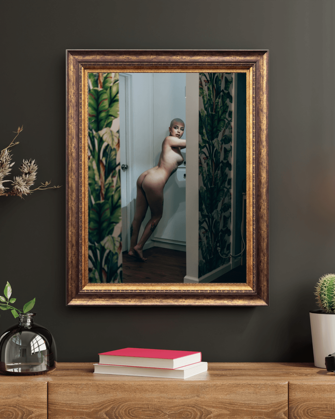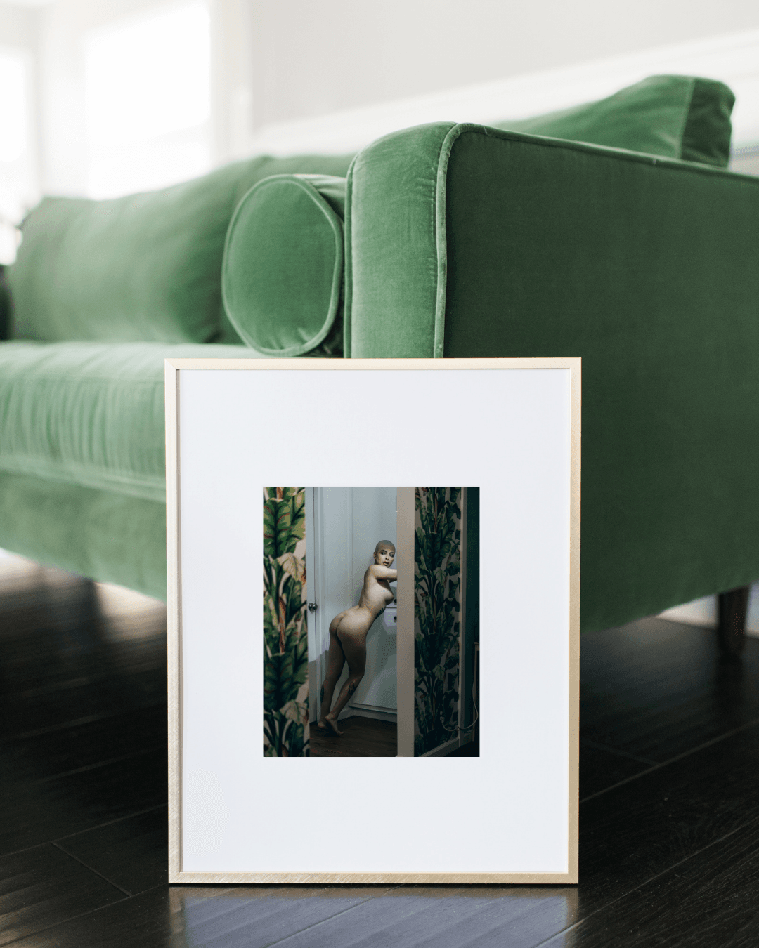 Step into the intimate world of “Madam Sophie in LA,” an evocative addition to the Room Noir collection. This fine art nude captures Madam Sophie’s captivating presence as she leans elegantly in a serene Los Angeles setting. Framed by vibrant tropical wallpaper and warm lighting, her bold silhouette contrasts beautifully against the minimalistic interior, creating a stunning interplay of strength and vulnerability.