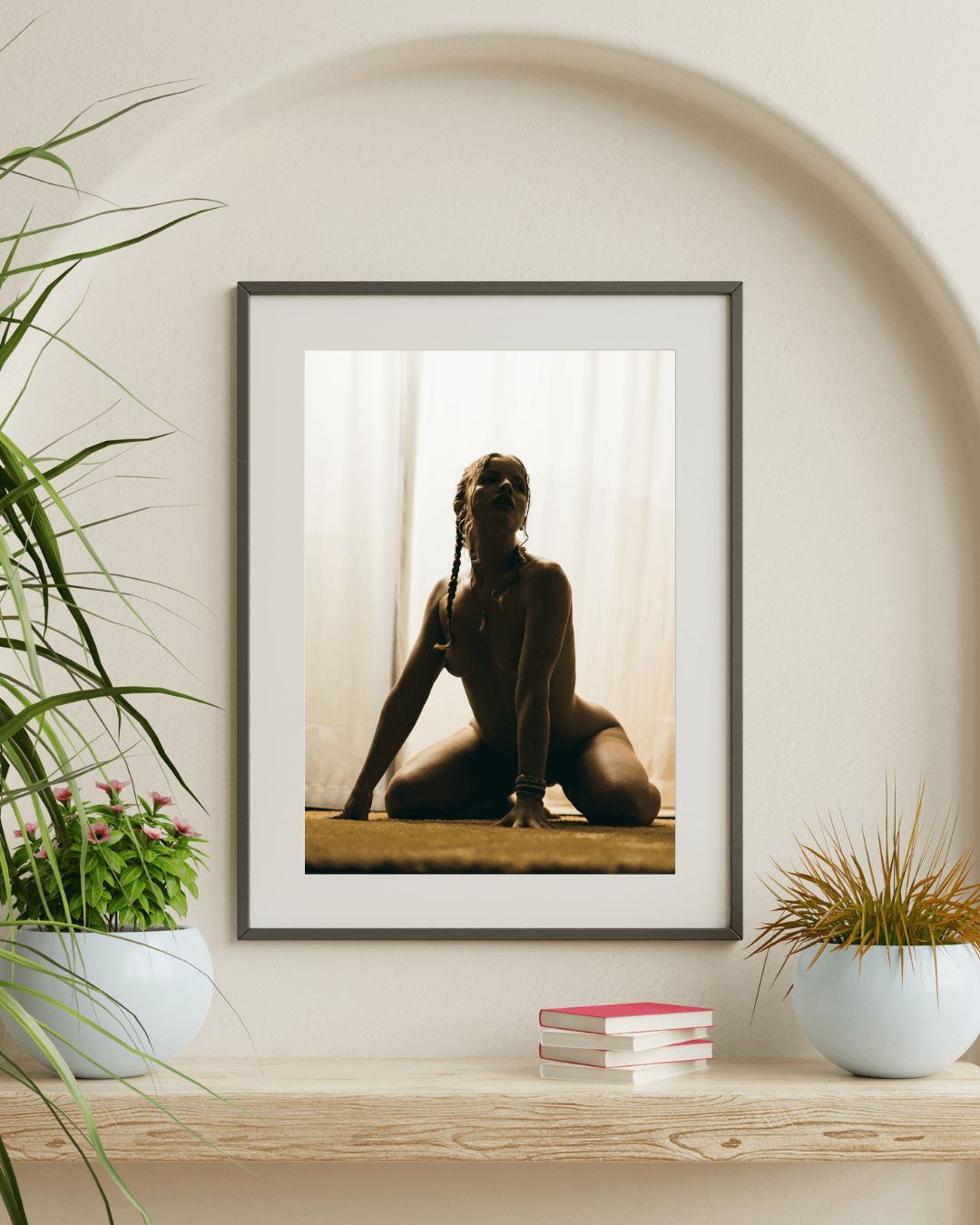 Bring the balance of nature and art into your space with “Amy in Tulum,” a stunning piece of fine art nude yoga that transforms any setting into a serene gallery.