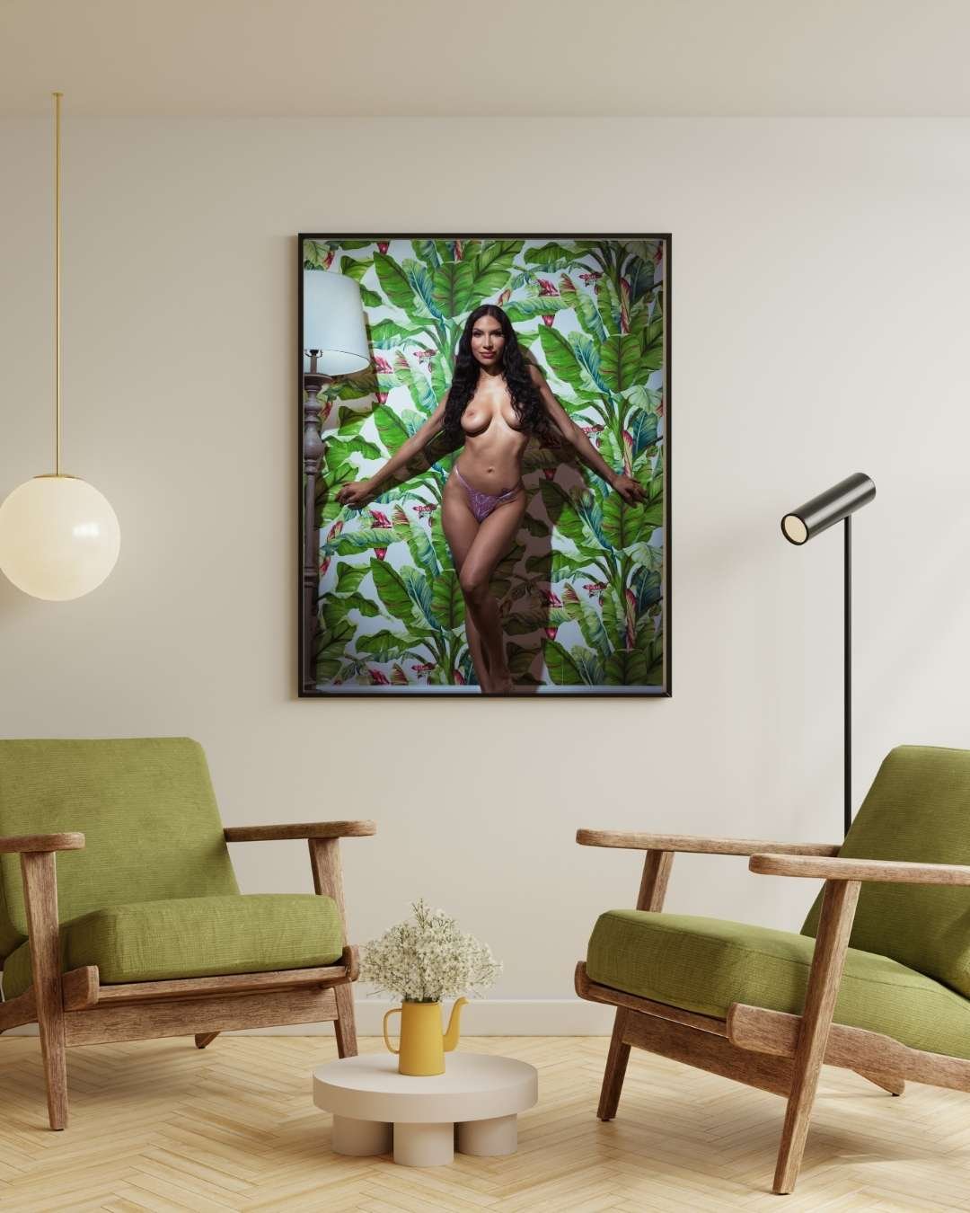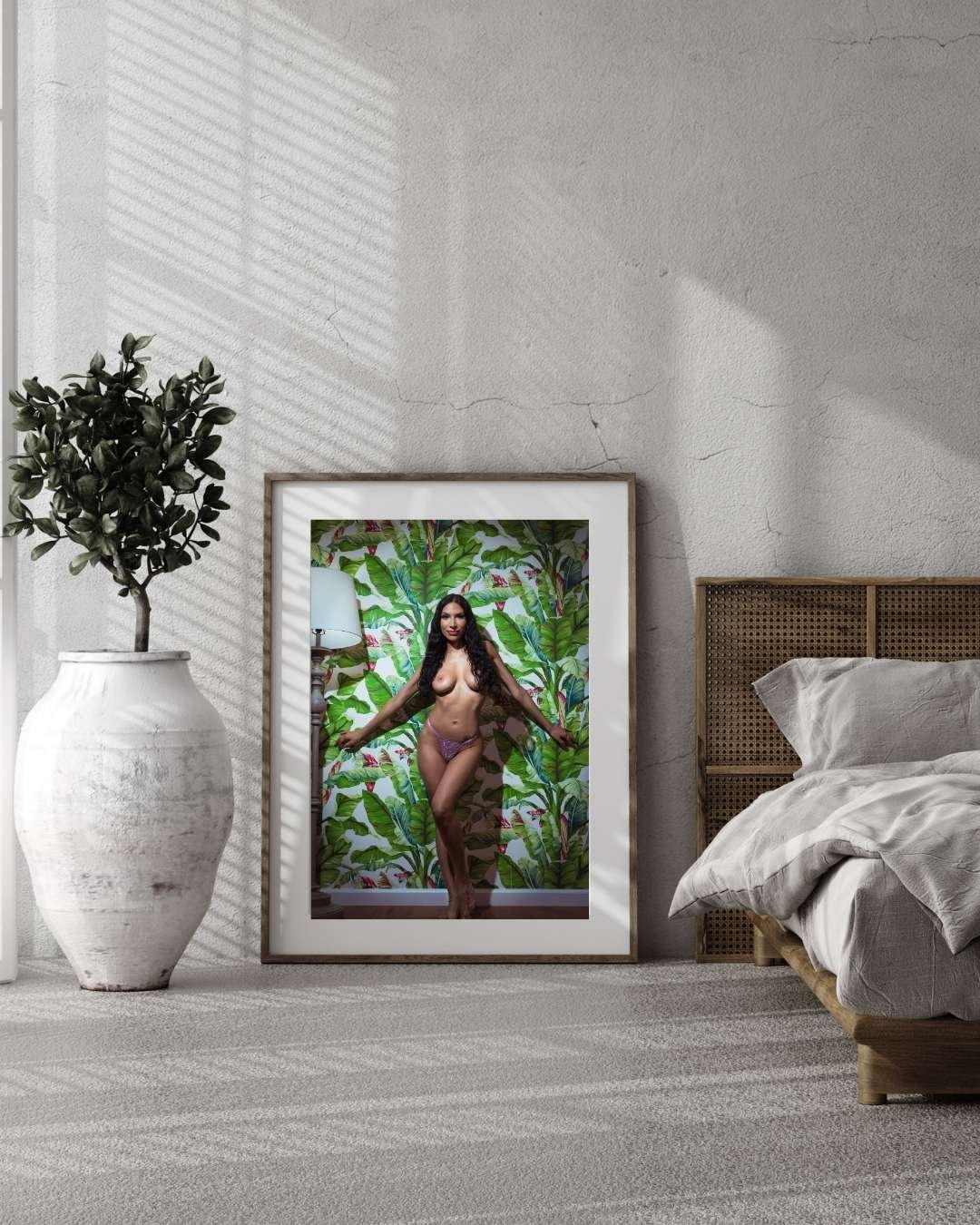 Bring a touch of bold sophistication and vibrant natural beauty into your space with “Solbaby’s Vibrant Elegance.” This tropical fine art nude print features Solbaby posed against a lush backdrop of banana leaves, blending bold sensuality with a radiant, lively environment. Shot in Los Angeles, this artwork captures the intersection of grace and untamed vibrance, making it a standout piece for your collection.
